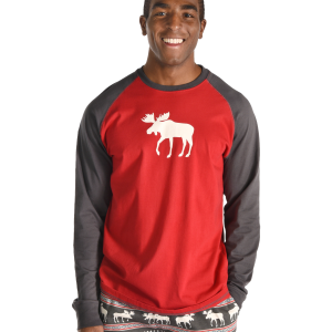 Our Moose Fair Isle tee is sure to be your new fav, especially during the cold months! This roomy men's pj tee is red with grey raglan sleeves, and their thinner fabric makes this tee great to sleep in. Matching pj pants can be purchased separately. Adult Sizes: XS- XXLa 100% Combed Cotton Knita Raglan Sleevesa Contrasting Flat Lock Sticha Box Tee Stylinga Permanent No Fade Printa Preshrunk