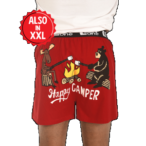 These silly boxers are a perfect add on to our Happy Camper collection! Made from soft 100% combed cotton knit, our boxers have a roomy fit with a button fly and an exposed elastic band. It's easy to see why the butt stops here! a 100% Combed Cotton Knita Exposed Elastic Waistbanda Button flya Backside is one panel of fabric - no seams to interfere with graphicsa Permanent No Fade Printa Preshrunk