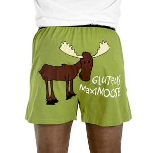 Cover that "Gluteus Maximoose" of yours in style! Made from soft 100% combed cotton knit, our boxers have a roomy fit with a button fly and an exposed elastic band. It's easy to see why the butt stops here!a 100% Combed Cotton Knita Exposed Elastic Waistbanda Button flya Backside is one panel of fabric - no seams to interfere with graphicsa Permanent No Fade Printa Preshrunk